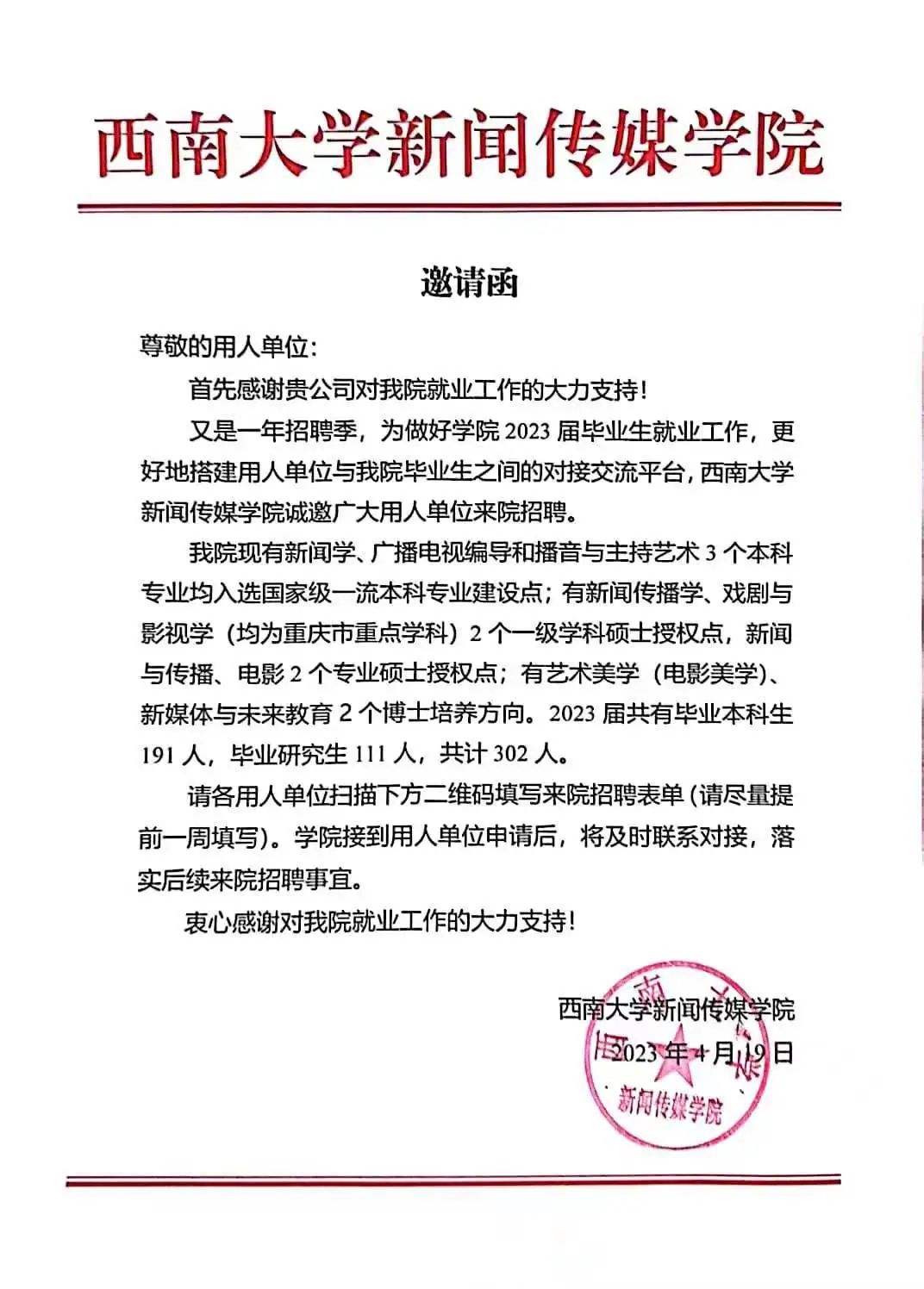 2023年,Usdt博彩平台 本科毕业生共有191人,新闻学专业62人,广播电视编导专业76人,播音与主持艺术专业53人。