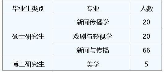 2023年,研究生毕业生共111人,博士5人,硕士106人。硕士毕业生中,新闻传播学、传播学、新闻学20人、戏剧与影视学专业20人、新闻与传播专业66人;博士毕业生5人,均为美学专业。